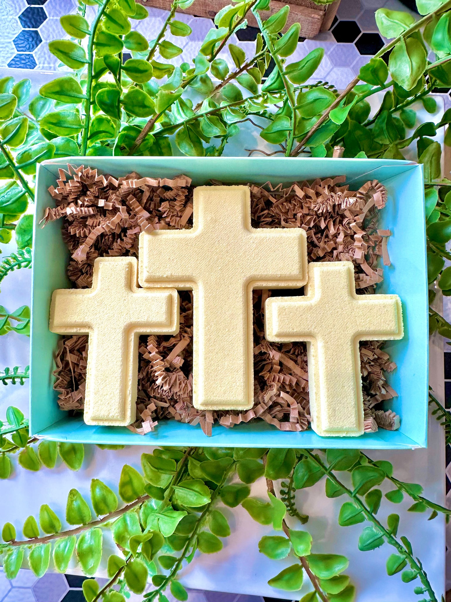 Three Bible-inspired Cross Bath Bombs nestled in a fun gift box filled with kraft paper shred and labeled.